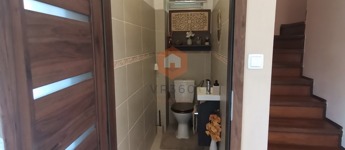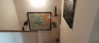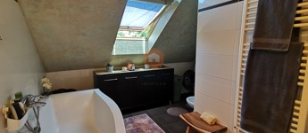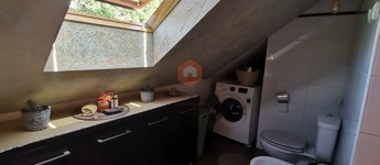Egyedileg díszített emeleti fürdőszoba, káddal, WC-vel, az alsó szinten külön WC, tároló szoba a lépcső alatt.