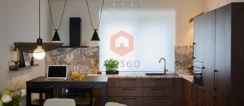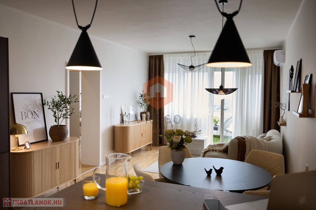 -amerikai konyhás tágas, napfényes nappali, konyhapult teljesen gépesített, indukciós főzőlappal, sütő, mikrohullámú sütő, páraelszívó, hűtő, mosogatógép, kombinált mosó-szárítógép