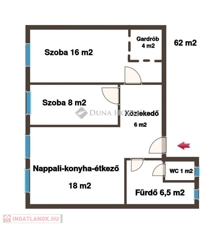 A lakás elrendezése praktikus és tágas: nappali, konyha-étkező,két, külön nyíló hálószoba, modern fürdőszoba.