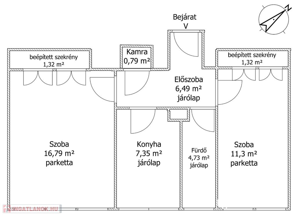 A konyhához külön konyhai tárolóhelyiség is van. A szobák parkettás, a többi helyiség járólapos padlóburkolattal rendelkezik.