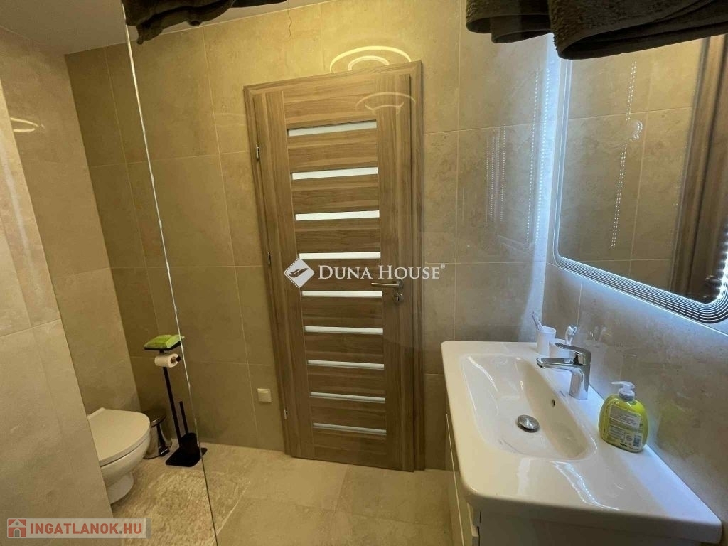 A lakás kilátása panorámás, a belső parkosított kertre, és a mesterségesen kialakított tóra néz.