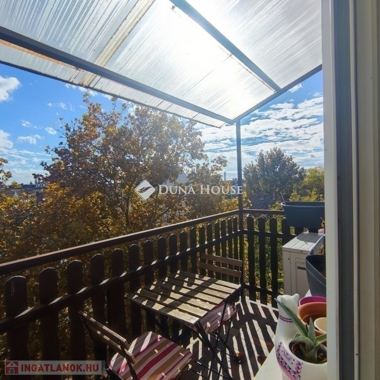 A lakás erkélye hangulatos, ideális hely a reggeli kávé vagy egy esti pihenés számára.