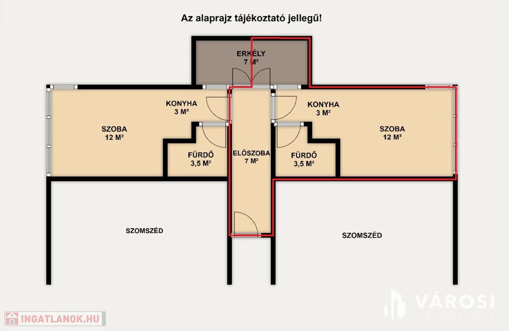Ez a hirdetés csak a lakás "jobb" oldalán elhelyezkedő apartmanra vonatkozik (az alaprajzon pirossal körberajzolt rész). Az így különválasztott apartman osztatlan közös tulajdonjoggal vásárolható meg.