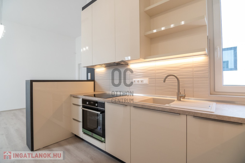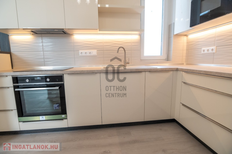 A konyha beépített magasfényű szekrényekkel, hűtővel, mikróval, mosogatógéppel reggelizőpulttal együtt eladó.
