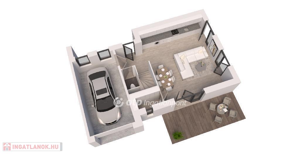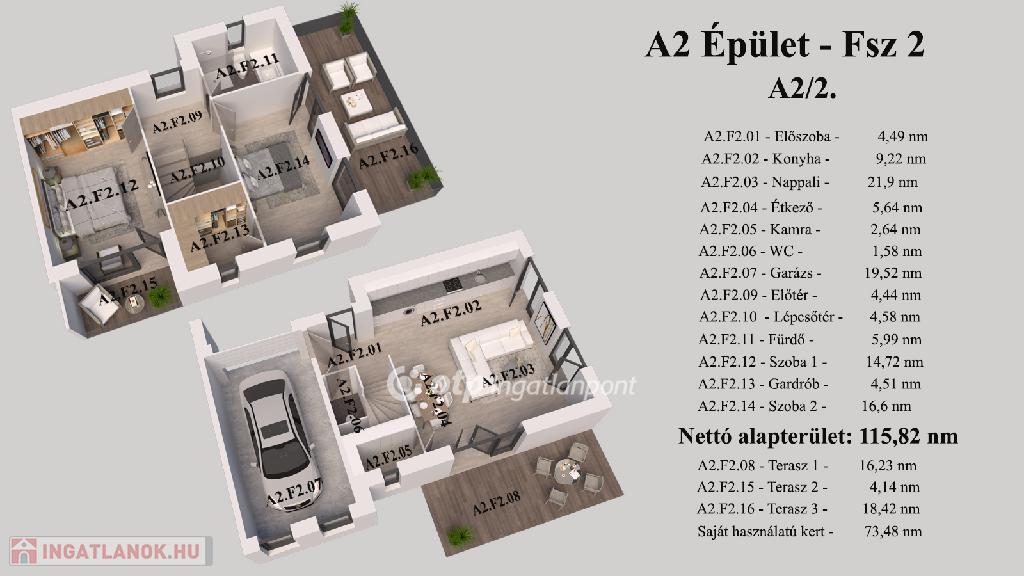 A földszinten található a tágas nappali, WC, a garázs és egy 16,23 nm terasz, amely közvetlen kertkapcsolattal rendelkezik. Az emeleten kapott helyet a két hálószoba, fürdőszoba és két különálló terasz(4,14 és 18,42 nm), amelyek biztosítják a kellemes pihenést.
