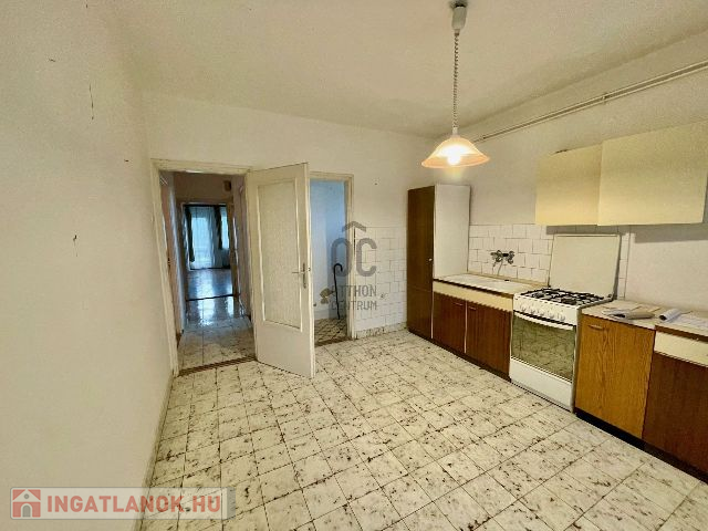 A viszonylag nagyméretű konyhában az étkezés is megoldott, de egybe is nyitható az egyik szobával és még így is marad két külön hálószoba a családnak.