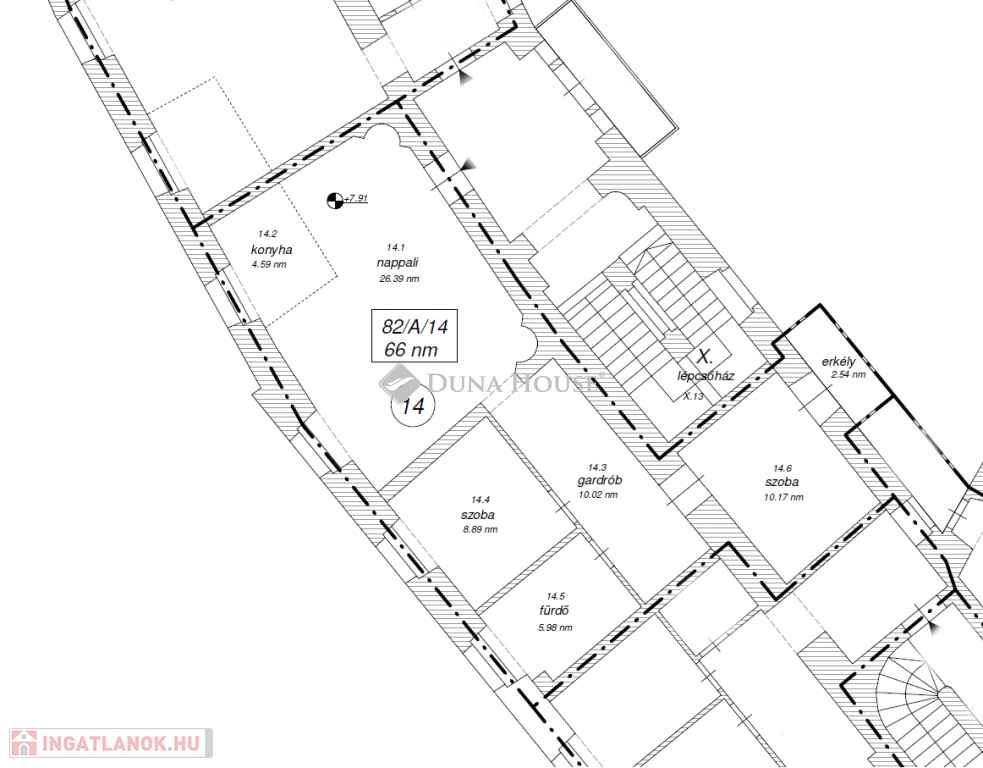B14 lakás : A második emeleti ingatlan 66 m2 alapterületű, amerikai konyhás nappali, két hálószoba, konyha-étkező, gardrób, erkély és fürdőszoba kapott helyet benne, a tágas világos lakás délnyugati tájolású, kilátással a sétáló utcára, az erkély a csendes belső udvarra tájolt.