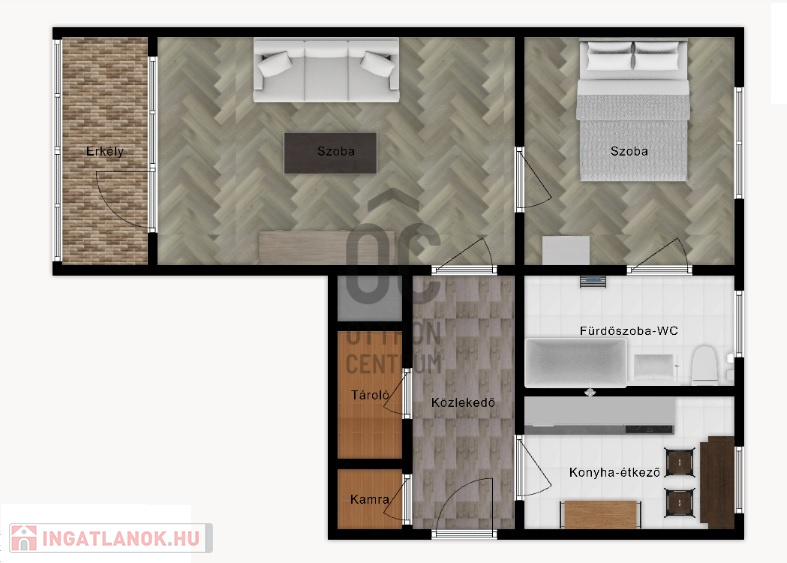 A lakás elrendezése kiváló: a két szobán kívül egy tágas előszoba-közlekedő, tároló, kamra, konyha-étkező, valamint fürdőszoba WC-vel is helyet kapott. Az erkélyről és az ablakokból minden irányba szép panoráma nyílik a városra.