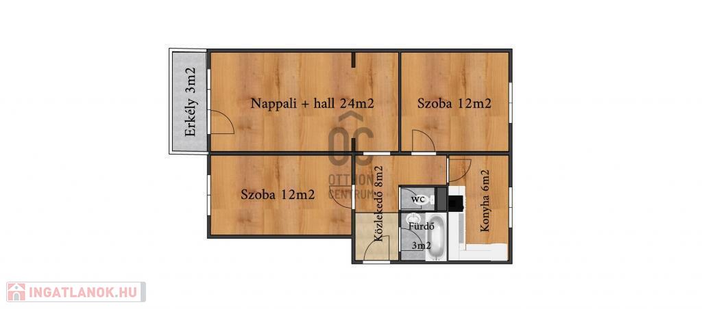 A három szobán kívül, a 68 m2-en a lakás magában foglal egy előszoba-közlekedőt, egy nagy konyha-étkezőt, egy nappalihoz csatlakozó hallt, egy fürdőszobát, egy mellékhelyiséget és egy napos erkélyt.