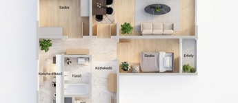 A lakásban a három szobán kívül található egy tágas konyha-étkező, fürdőszoba és külön mellékhelyiség.