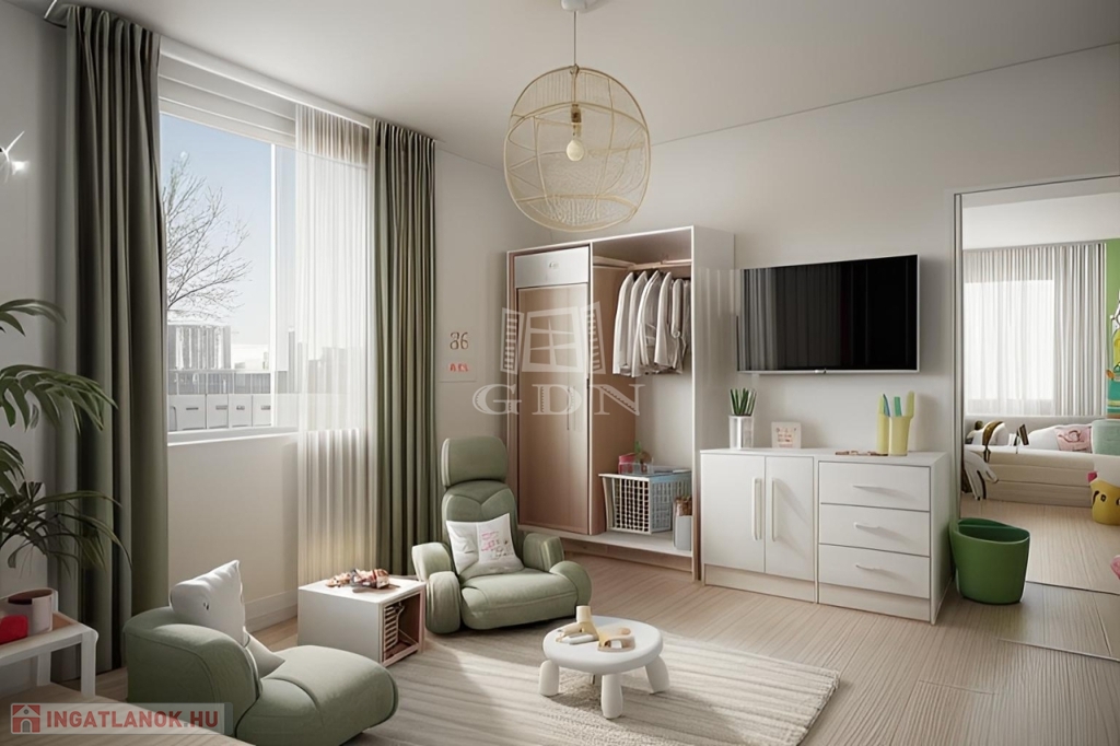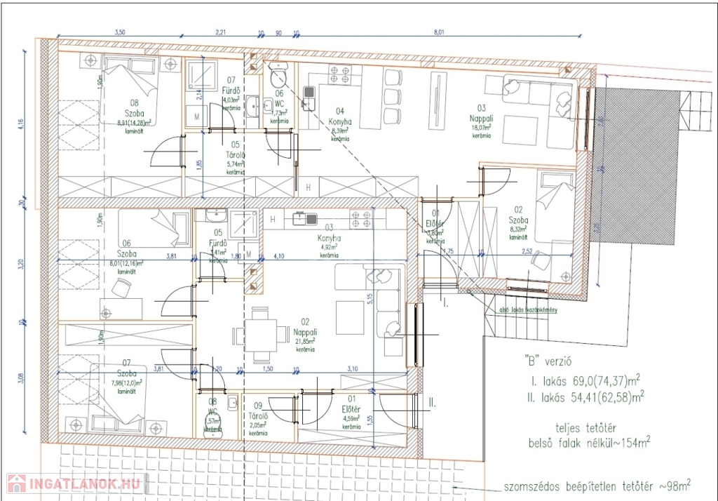 • a másik lakás 54 m² alapterületű, mindkettő amerikai konyhás nappali + 2 szobás elrendezéssel.