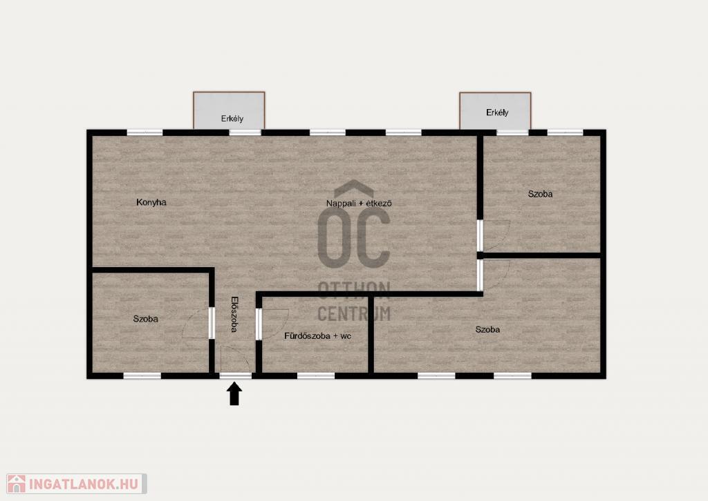 A szobák elrendezése a mellékelt alaprajzon látható, nappali + étkező + konyha + 3 szoba + fürdőszoba lett kialakítva.