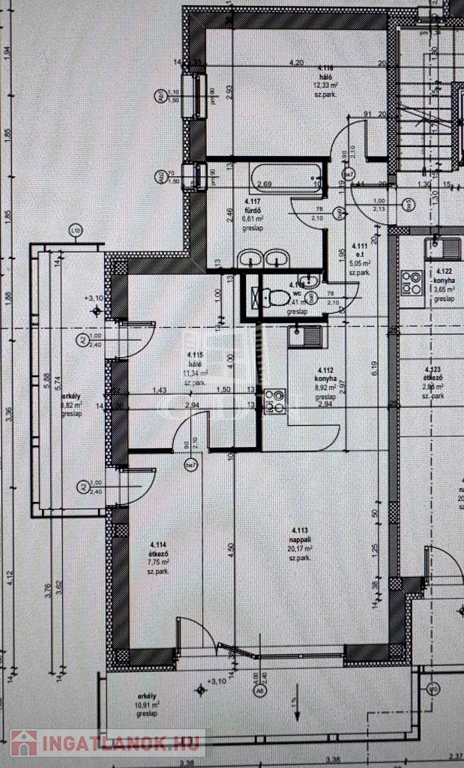nappali-konyha-étkező 36,84m2, szoba 12,33m2, szoba 11,34m2, fürdőszoba 6,61m2, toalett 1,41m2, előszoba 5,05m2, erkély 10,91m2, erkély 8,82m2;