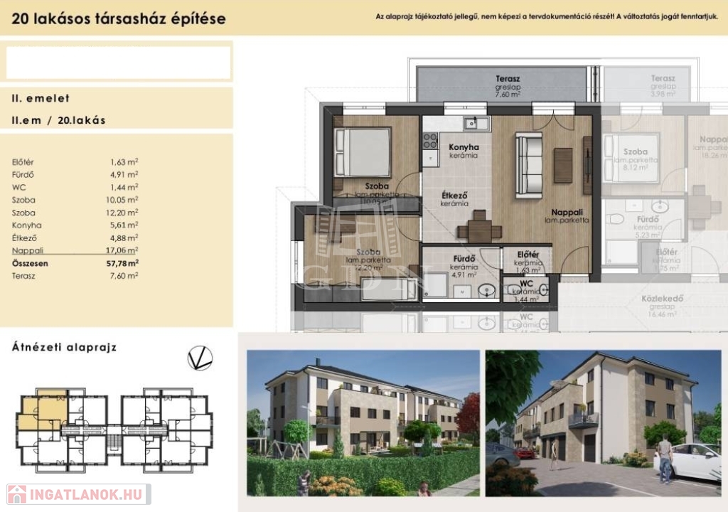 A három szintes kettő emeletes, 20 lakásos modern társasházak minden igényt kielégítő, magas műszaki tartalommal valósulnak meg. A kiváló tájolású 40-67 m2 közötti ingatlanokat nagyon jó elosztás és élhető terek jellemzik. A lakások nappali+egy , nappali +kettő szobásak lesznek. A földszinti lakások komfortérzetét teraszok, saját kertek az emeleti lakásokét jó méretű erkélyek fokozzák. Nyílászárói 3 rétegű fokozottan hő- és hangszigetelt üvegezésű műanyag ablakok és erkélyajtók, redőny fogadására alkalmas szemöldök kialakítással. A lakások bejárati ajtaja MABISZ minősítéssel rendelkező tömör, több ponton záródó biztonsági ajtó. Fűtése központi gázfűtés tervezett, kondenzációs gázkazánnal a lakásokban egyedi hőmennyiség szabályozással és mérővel, padlófűtéses hőleadással. Klímaelőkészítést a vételár magában foglalja. Hideg -meleg burkolatok ,szaniterek, csaptelepek, beltéri ajtók választhatók. Az ingatlanhoz felszíni parkoló, garázs vásárolható.