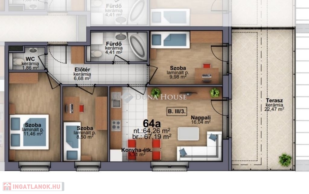 Szombathelyen a Mira Garden2 lakóparkban várja új tulajdonosát ez a 3. emeleti, nappali + 3 szobás, 64 m2-es lakás, amely 22,47 m2-es félig fedett terasszal rendelkezik.
