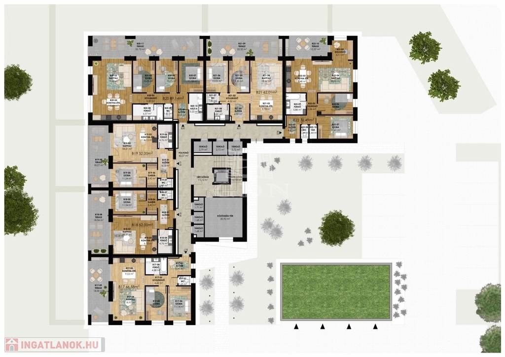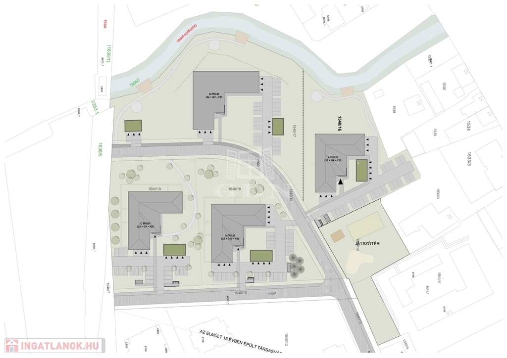 Modern megjelenésű, értékálló, kényelmes és élhető lakóparkban valamint az épületekhez kapcsolódó egyedi lakókörnyezetben szeretne élni? Hamarosan megvalósulhat az álma. A Gyöngyös-patak partján belváros közeli prémium lakások épülnek 20 000 m2-es területen, több ütemben. A tervezés során a funkció, a környezettudatosság és a kényelem voltak a legfontosabb tervezési szempontok. Így különösen az épületek szellős elhelyezése, a lakások kedvező tájolása, az épületek körül a maximális zöldterület és a megfelelő garázs szám biztosítása, a színvonalas közösségi funkciók kialakítása. A lakások értékállóságát és kényelmét az átgondolt tervezés, a minőségi anyagok használata, a nagy méretű, intim teraszok, a lift, a megújuló energia, egyedi és közös tárolók, fedett beállók, garázsok biztosítják. Az alkalmazott szerkezetek megfelelnek a ma érvényes “közel nulla energiaigényű épületek” követelményeinek. Az épületek előtti sétányok díszkivilágítást kapnak mozgás- és alkonykapcsolás vezérlésével. A sétányokról különböző típusú gépkocsi beállóhelyek – felszíni fedett, és normál parkolók ill. garázsok - közelíthetők meg. Egyes parkolók között beruházói döntés szerinti helyen és műszaki kialakítással, elektromos töltőpont csatlakozási lehetőség biztosítható. A közös területek alkalmasak játékra, pihenésre, a földszinti lakások előtti kijelölt zöldterület saját használata mellett. A ház kaputelefon rendszerrel lesz felszerelve. A lépcsőházban és egyéb közös terekben légterenként időkapcsolós világítás lesz kiépítve. A mai korszerű követelményeknek, az épületek hő és hangszigetelése a vonatkozó szabályoknak maximálisan megfelel. A külső hőszigetelés vastagsága 16-20 cm. Az ablakok 3 rétegű üvegezéssel kiváló hőszigetelésű nyílászárók. A lakások padlófűtéssel rendelkeznek, mely a szabadabb belsőépítészeti kialakításoknak ad lehetőséget. A tervek szerint a központi gépészet távfelügyeleti rendszerrel ellátott, távfűtés, így a karbantartás és üzemeltetés során ez gyors beavatkozást és üzembiztonságot eredményez. A fogyasztás egyedi mérőkkel mért, az elszámolást a közös képviselő végzi. A megújuló energia tervek szerint a megfelelő energetikai szabályok alapján kerül telepítésre pl. napelemrendszer. (Kiviteli terv során változhat: kondenzációs gázkazán és/vagy hőszivattyú). Belsőépítész által tervezett lakások, nagy teraszokkal kapcsolódnak a természethez. Befektetőknek, nagy családoknak alkalmas lakások kerülnek kialakításra. A kisebb lakások 52 m2, 62 m2, a nagyobb lakások 67 m2, 76 m2 és 89 m2 nagyságúak lesznek. 12-33 m2 fedett intim teraszok kerülnek kialakításra. Aktuális, bevezető ajánlatban az 1db felszíni parkolót, vízlágyító rendszert, klíma előkészítést ajándékba adja a beruházó. A lakásokhoz tárolók, garázsok vásárolhatók. Kimerítőbb tájékoztatást személyesen. A hírdetésben szereplő lakás 3.emelet 19.