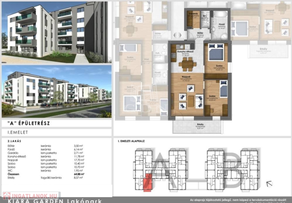 Szombathely zöldövezeti, dinamikusan fejlődő városrészén, energiahatékony, modern lakások várják új tulajdonosaikat. Kiara Garden lakóparkban kettő ütemben épülő , minden igényt kielégítő lakásai nappali+1 szobával, nappali+2 szobával, nappali+ 3 szobával fognak rendelkezni. Az ingatlanokhoz nagy erkélyek teraszok is tartoznak. A legnagyobb lakás dupla komfortos kialakítású lesz. Egyedülállóktól a nagy családosokig megfelelő otthona lehet bárkinek. A belváros közeli ingatlanok lehetőséget biztosítanak egyedi belső kialakításokra. A lakás gazdaságos fűtéséről és melegvíz ellátásáról távhő szolgáltató gondoskodik. A fűtésrendszer egyedileg szabályozható, saját hőmennyiség mérővel ellátott. A hőleadás padlófűtésen keresztül történik. Az ingatlanok ideális hőmérsékletét, a nappaliban elhelyezett split klíma biztosítja. Az épületben kellő számú zárható tároló kerül kialakításra, külön bejárattal. ( 2.96 m2-es tároló 1 790 000 Ft ) Természetesen vannak nagyobb tárolók is. A lakótömbök udvarán található felszíni parkolók ára 1 490 000 Ft. Bővebb tájékoztatásért kérem vegye fel velem a kapcsolatot.