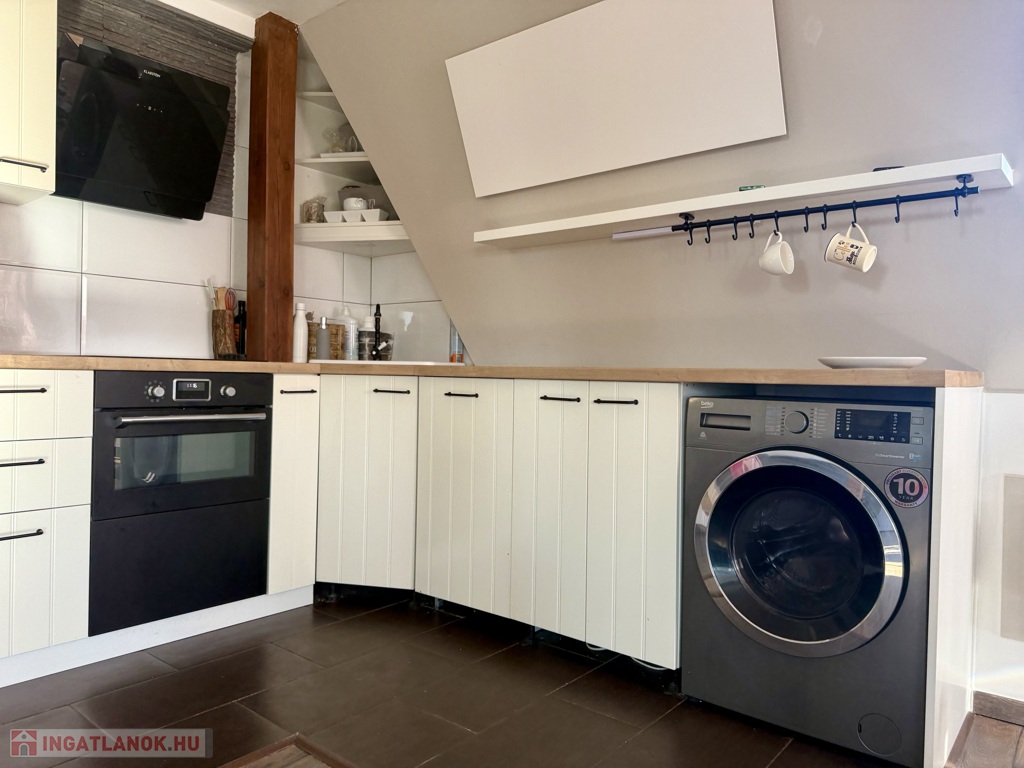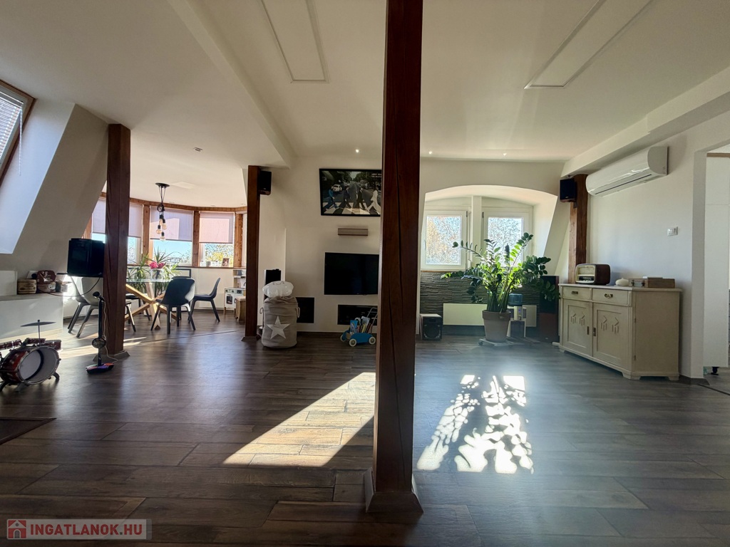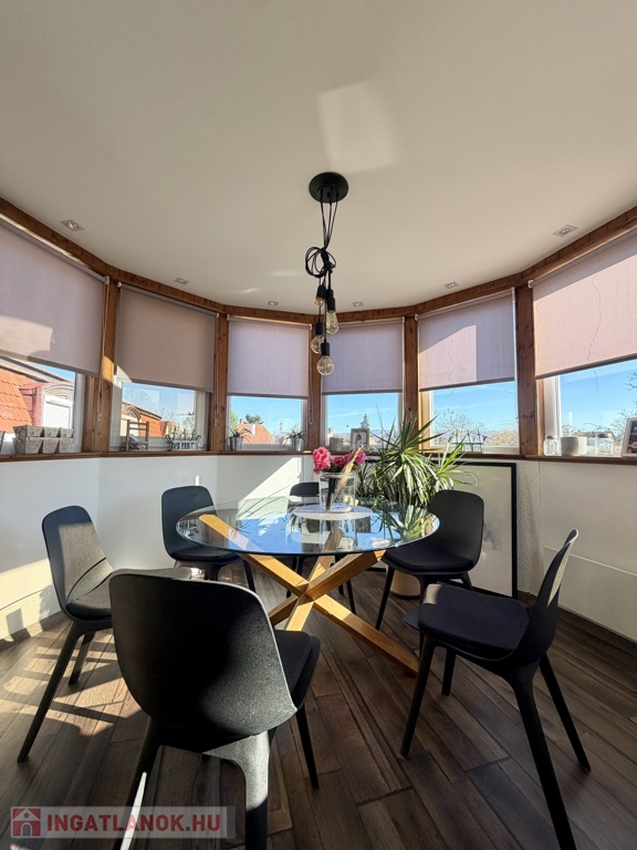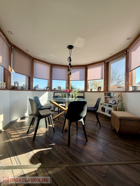 A hálószobából egy kis erkély is nyílik, a nappali-étkező rész pedig a lakás igazi különlegessége – egy toronyszerű, körbenapozott toronyszerű étkezőrész, amely egyedi karaktert és meleg, barátságos hangulatot ad az egész otthonnak.