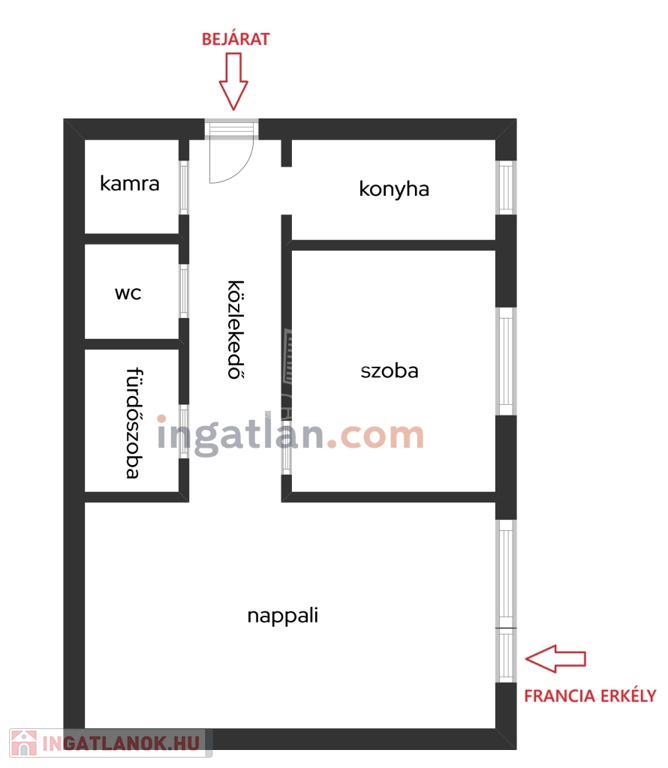 - a tágas, francia erkélyes nappalin túl találunk a lakásban egy szintén kényelmes méretű hálószobát, konyhát, kamrát, fürdőszobát, külön wc-t, valamint egy közlekedőt