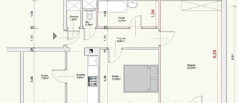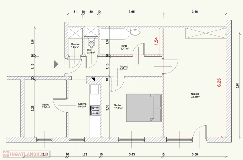 A lakás 4 szintes társas-ház negyedik emeletén helyezkedik el. Elosztása: előtér 6,06 m2, nappali 22,25 m2, szoba 12,00 m2, szoba 7,90 m2, konyha 5,80 m2, fürdőszoba 5,47 m2, külön toalett 0,76 m2, gardrób 1,25 m2, az ingatlanhoz a földszinten 4 nm zárható tároló is tartozik