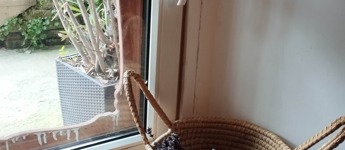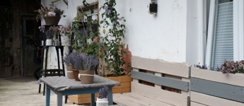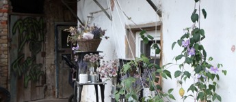 Az épület udvarán birsalmafa, kisebb cserjék, futónövények, cserepes virágok találhatók.