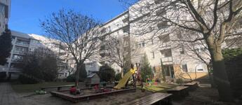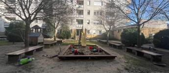A belső udvar rendezett, zöldövezettel, játszótérrel