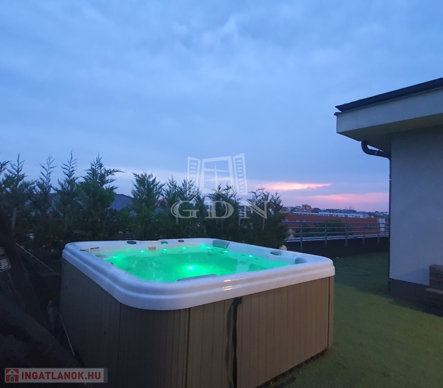 A lakás ékét, egyediségét jelentő, fantasztikus kilátással bíró teraszra több helyiségből is kijuthatunk, ahol a 7 személyes JAKUZZI is helyet kapott a kerti bútorok, a grillező és a focikapuk mellett, melyek mind a kellemes időtöltést biztosítják.