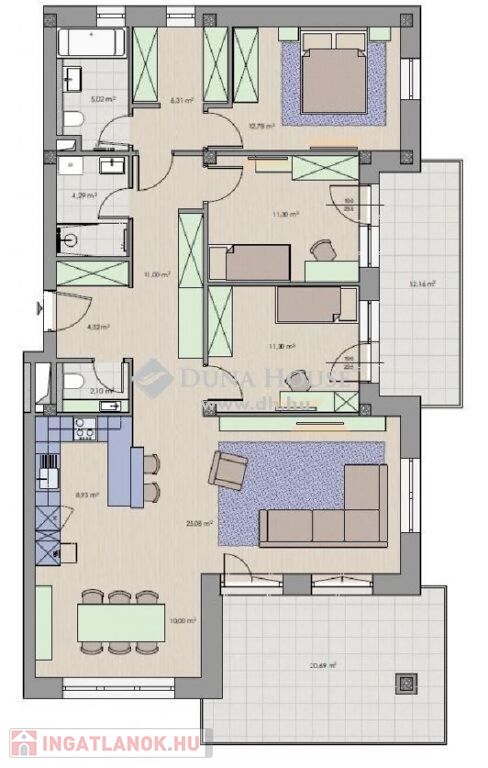 A lakások 3-4 szobásak, minden lakás déli vagy nyugati tájolású, nagy teraszos, a teraszok nem néznek egymásra.