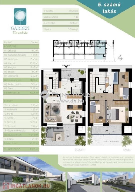 A projekt keretein belül 5 db lakóingatlan épül. Mindegyik belső két szintes. Az alsó szinten a bejárat mellett helyet kapott az egyik oldalon egy zuhanyzós fürdőszoba WC-vel, a másikon a lépcsőtér. A nappali-amerikai konyha minden lakásnál tágas és napfényes D-i tájolásából adódóan. Innen nyílik a térkövezett terasz.