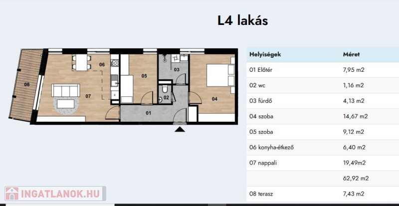 - 62,92 négyzetméter, alacsony energiaigényű, 7,43 négyzetméteres terasszal