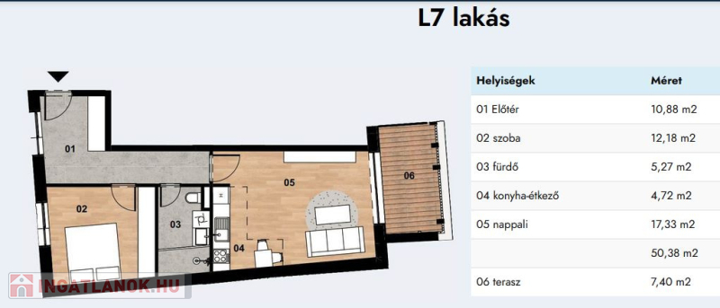 - 50,38 négyzetméter, alacsony energiaigényű, 7,40 négyzetméteres terasszal