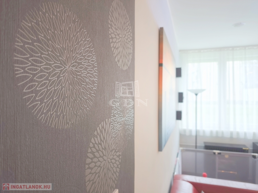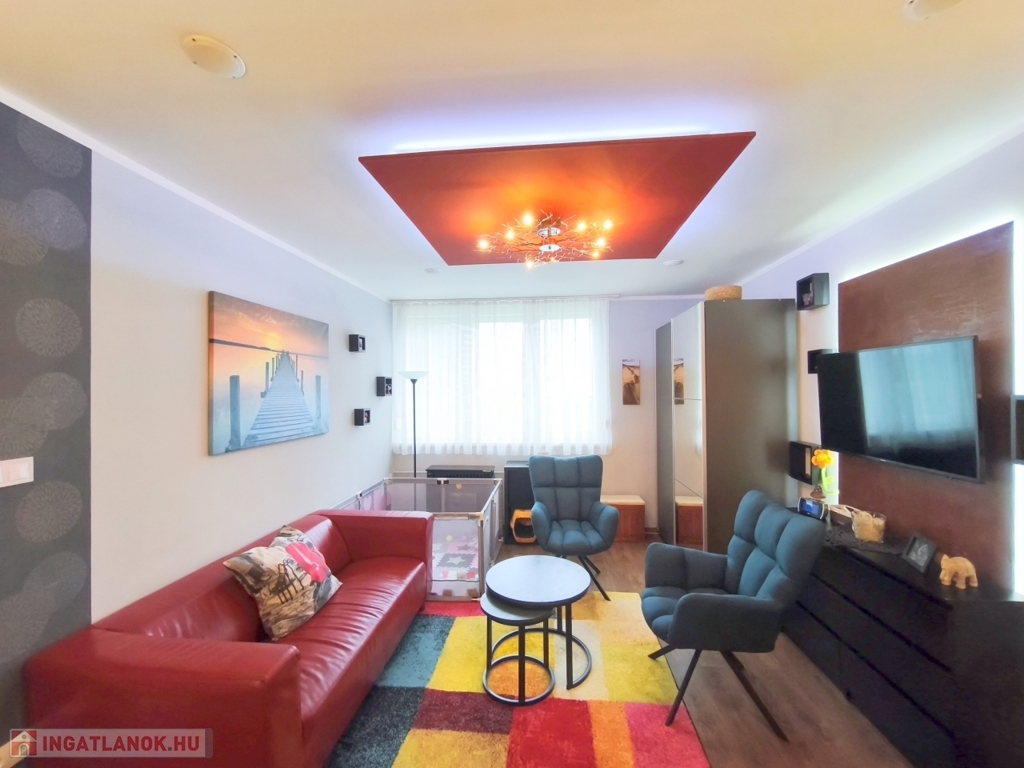 A lakás teljes egészében álmennyezet található beépített hangszórókkal és igényes, rejtett LED világításokkal, amelyek modern és hangulatos megjelenést adnak az otthonnak.
