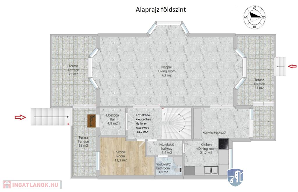 A földszinten egy 63 m2-es nappali található kandallóval, egy nagy gépiesített konyha étkezővel, további egy szobával és egy fürdőszobával. Elől és hátul is nagy terasz lett építve hozzá a szinthez.