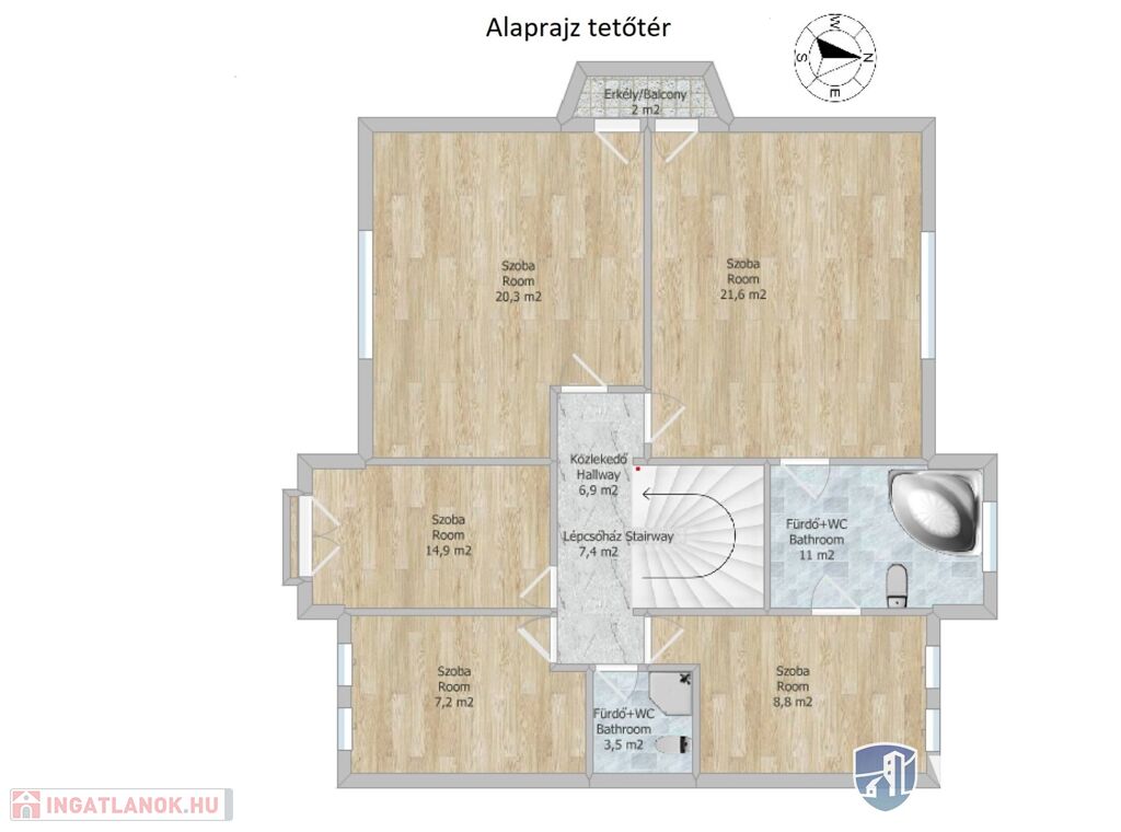 A tetőtéren 4 nagy és egy félszoba található. Itt két fürdőszoba is megtalálható.
