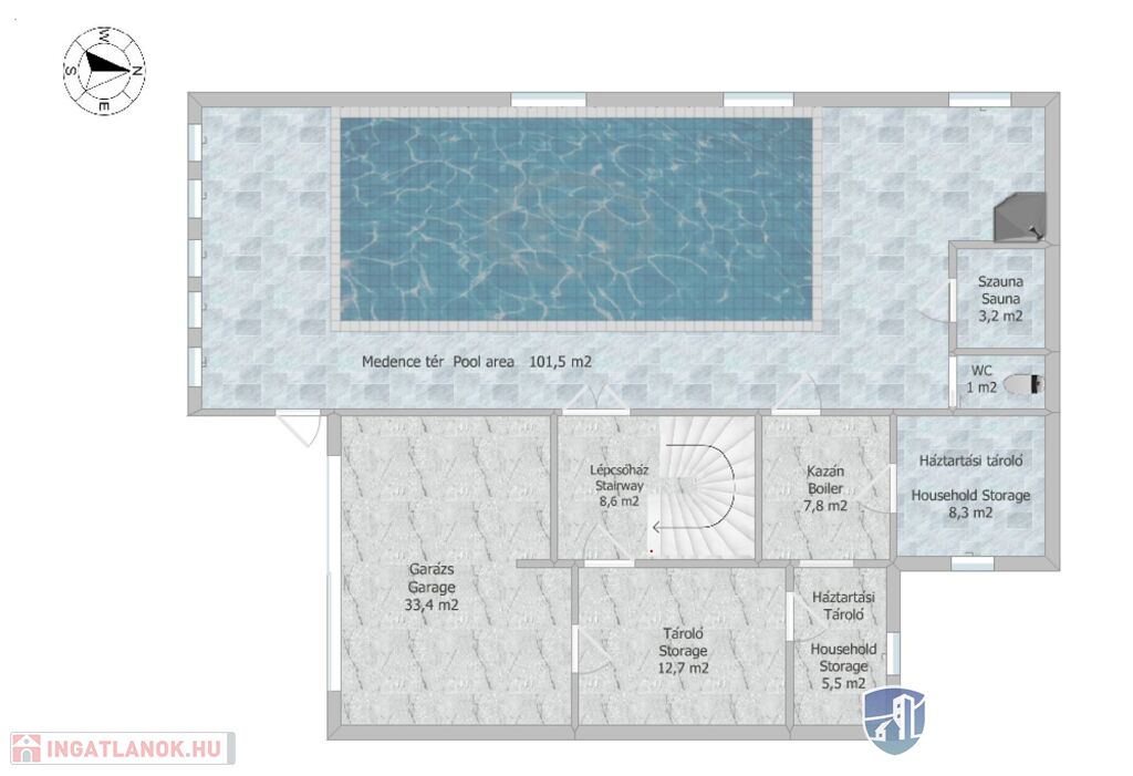 A ház szuterén részén egy több, mint 100 nm-es medence tér található meg, szaunával és úszómedencével. Itt fal, padló és léghűtés és fűtés is van. Ezen a szinten találhatók még tárolók is.
