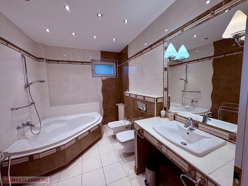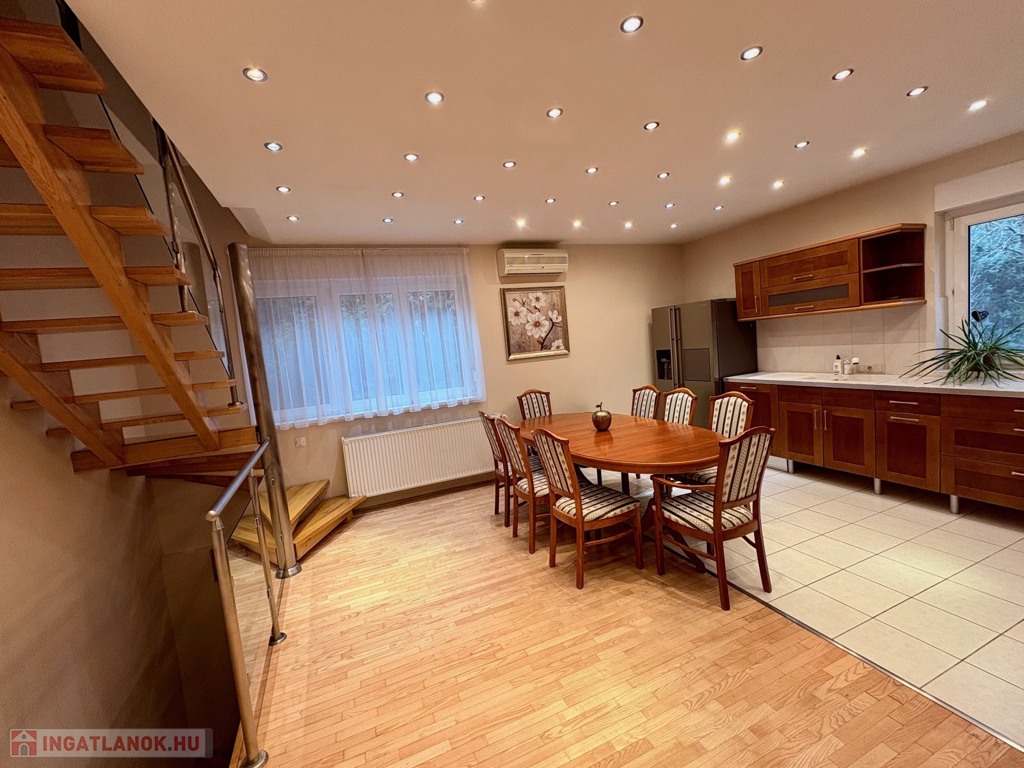 Kifogástalan állapotú, tökéletesen felszerelt konyha-, gardrób- és fürdőszobai beépített szekrények, minden szobában és az étkezőben klíma, ablakokon redőny, motoros külső árnyékoló, riasztórendszer, kerti automata öntözőrendszer, elektromos garázs- és kerti kapu, új kondenzációs Viessmann fali kazán radiátoros hőleadással.