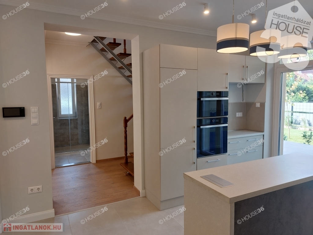 Kecskeméten a belváros kertvárosában, a Villanegyedben kiadó egy 2024-ben, modern stílusban felújított, bútorozott, 135 m2-es kétszintes ház, plusz nagy terasz, egy 305 m2-es telken.
