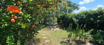 A gondosan kialakított udvart gyümölcsfák, rózsák és nagy árnyékot adó fák díszítik, intim, nyugodt hangulatot teremtve.