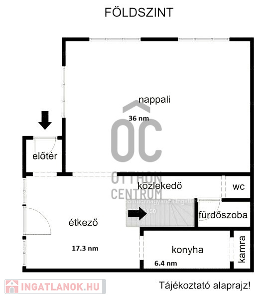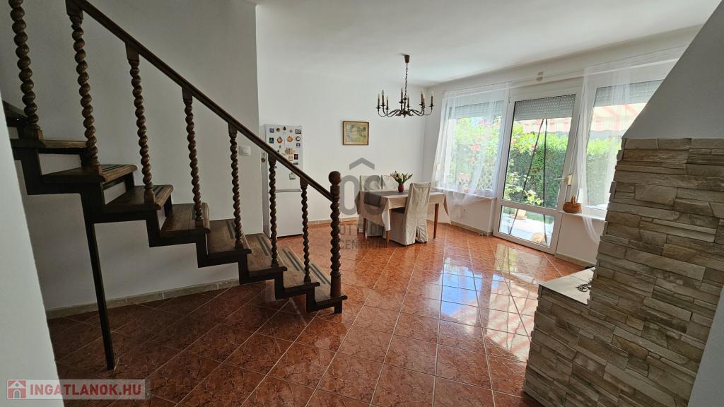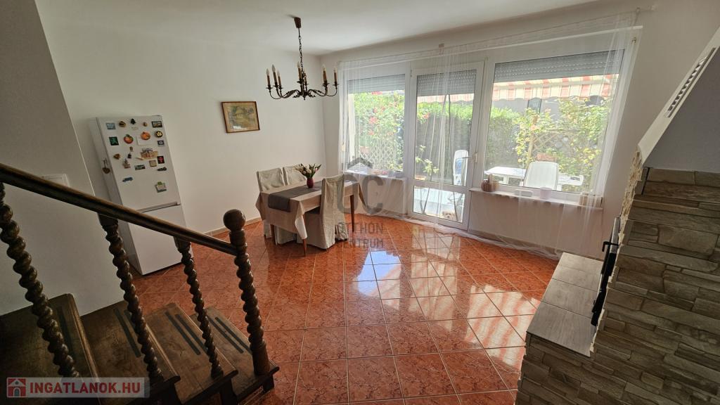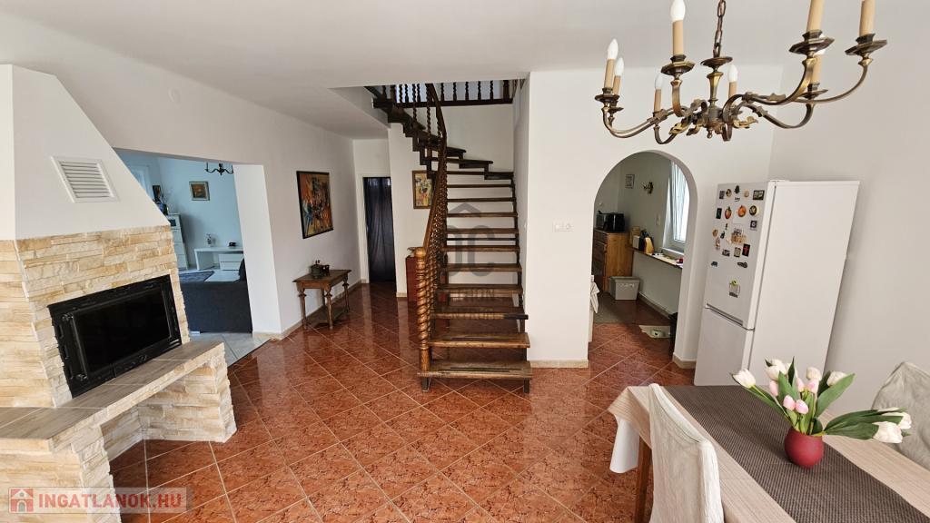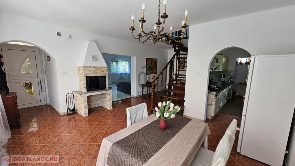 Alsó szint: tágas nappali, étkező, konyha, kamra, fürdőszoba, külön WC