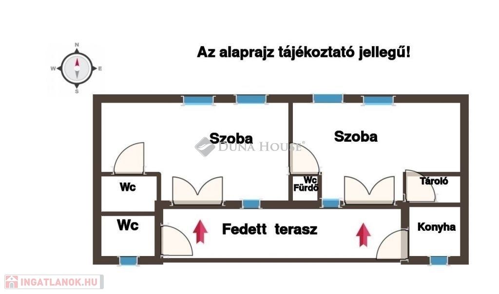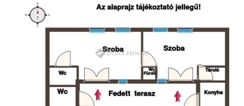 Az ingatlan elosztása: 2 szoba, 2 db wc, fürdőszoba-wc, konyha, tároló, és egy 28 nm-es fedett terasz kialakítású.