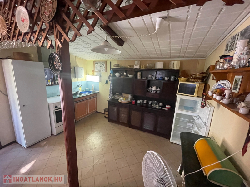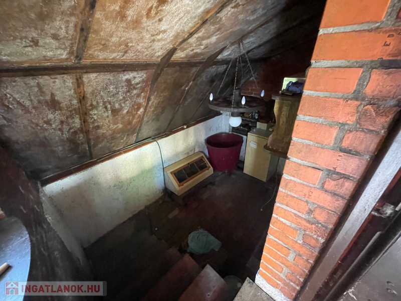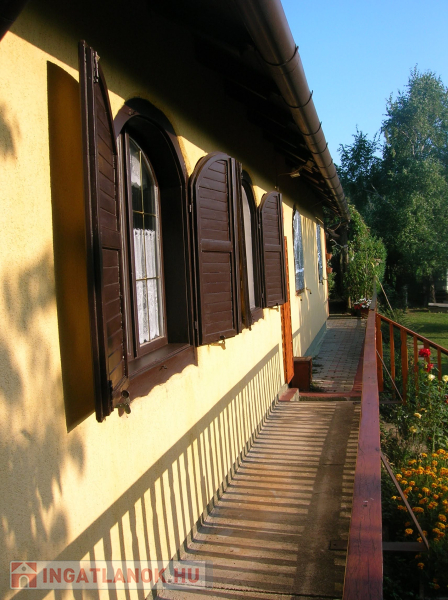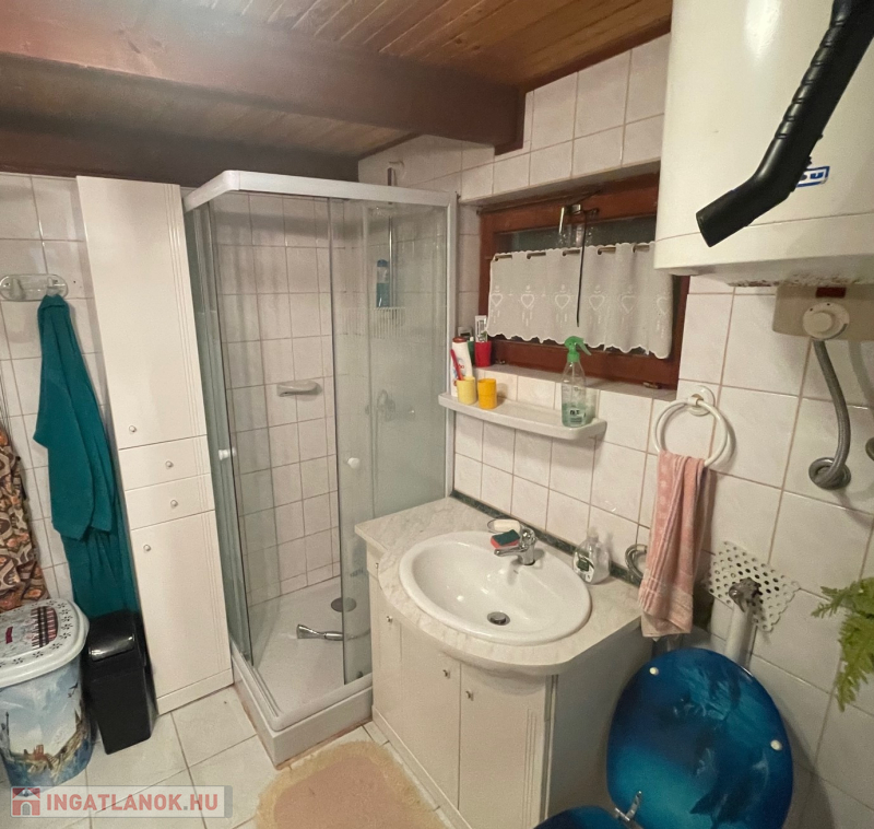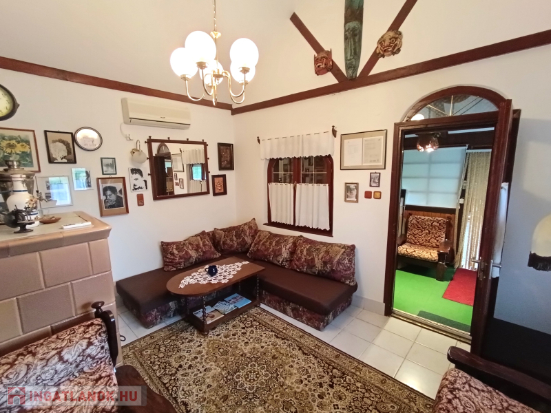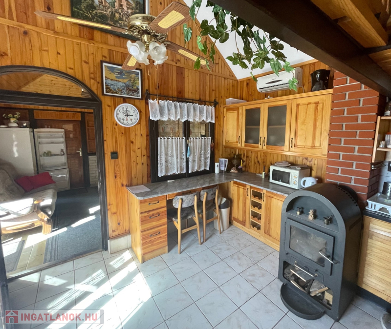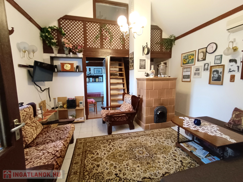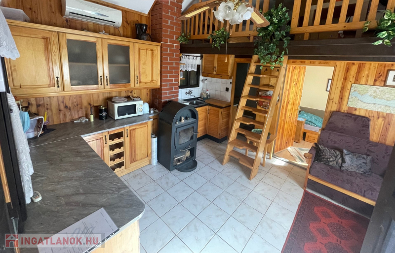 Jobb oldali, téglaépítésű lakrész: nappali, galériázott háló, zuhanyzós fürdőszoba + WC, tágas előtér, hálószoba. Fűtése: klíma és cserépkályha