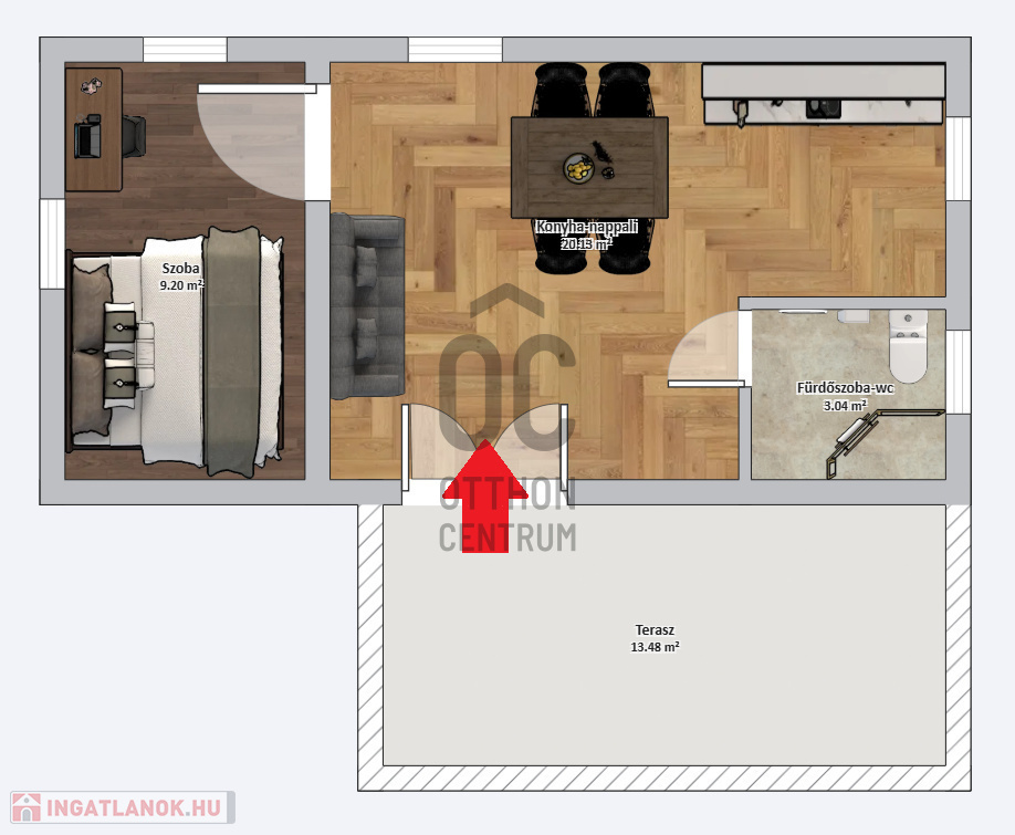 - Felosztása: 1 szoba, fürdő-wc, és egy konyha-nappali.