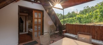 A 4457 m2-es szabálytalan alakú, enyhén lejtős telken épült KNY-i felvésű, belső hasznos területét tekintve 160 m2-es ház három különálló apartmanra tagolható, mindegyike külön külső terasszal, kialakított fürdőszobával, konyhával, hálóhelyiséggel rendelkezik. Ehhez csatlakozik egy 35 m2-es borospince a ház oldalában.