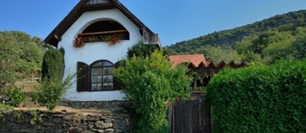 Hangulatos kertjét kerti terasz egyedi kézműves bútorokkal, tűzrakóhely, fatároló, gyümölcsfák, és számtalan színben játszó virágkoszorú foglalja keretbe.