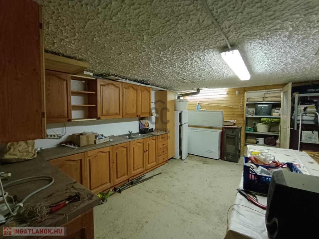 - pinceszinten 60 m2 alapterülettel konyha-étkező, fürdőszoba- zuhanyzóval, tároló, garázs /20 m2/ kapott helyet