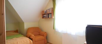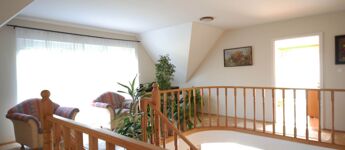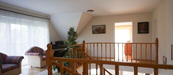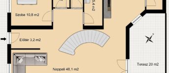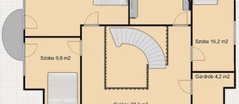 Az emeleten három hálószoba, fürdőszoba, gardrób, galéria és két erkély biztosítja a családtagok számára a nyugodt, szeparált életteret.