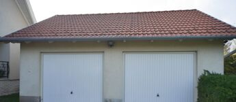 Az udvarban különálló, téglaépítésű, cserépfedésű dupla garázs található, előtte térkövezett beállóval, amely további járművek parkolását is lehetővé teszi a zárt területen belül.