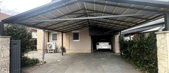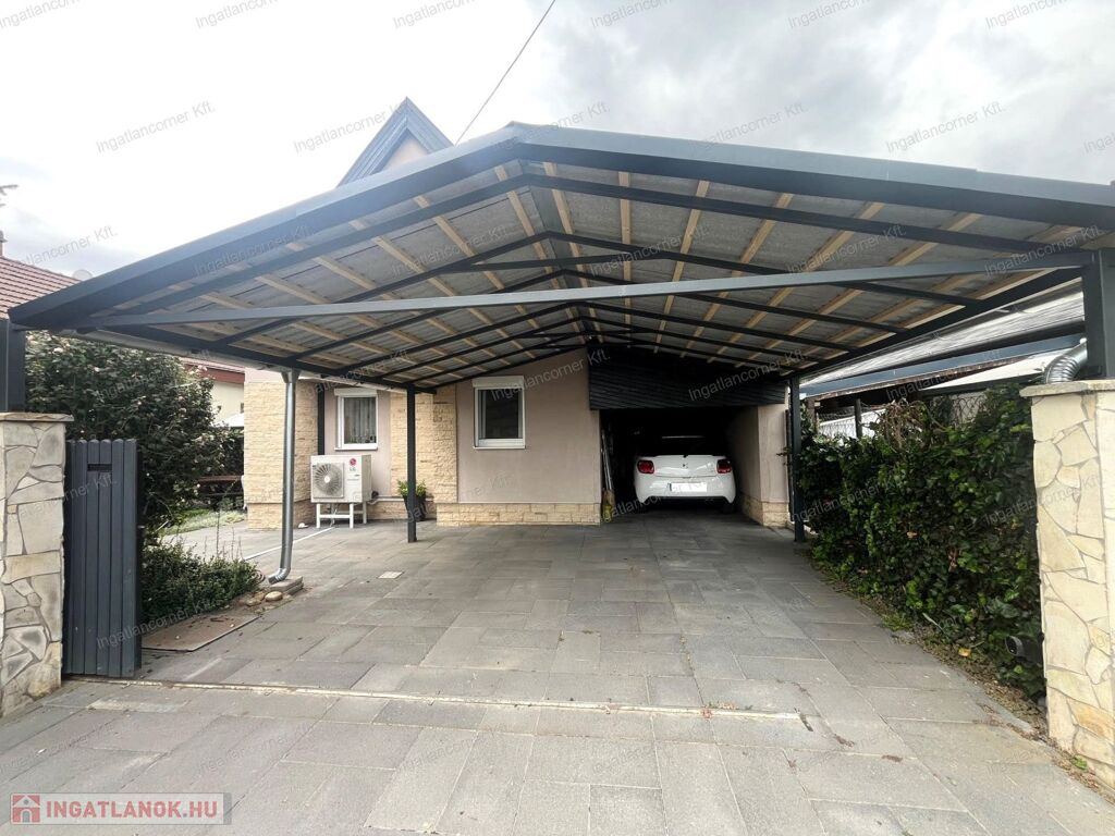 Parkolás: 1 GARÁZS (12 m²) + 3 autó fedett kocsibeálló (30 m²), 6 m széles távirányítású elektromos tolókapu.