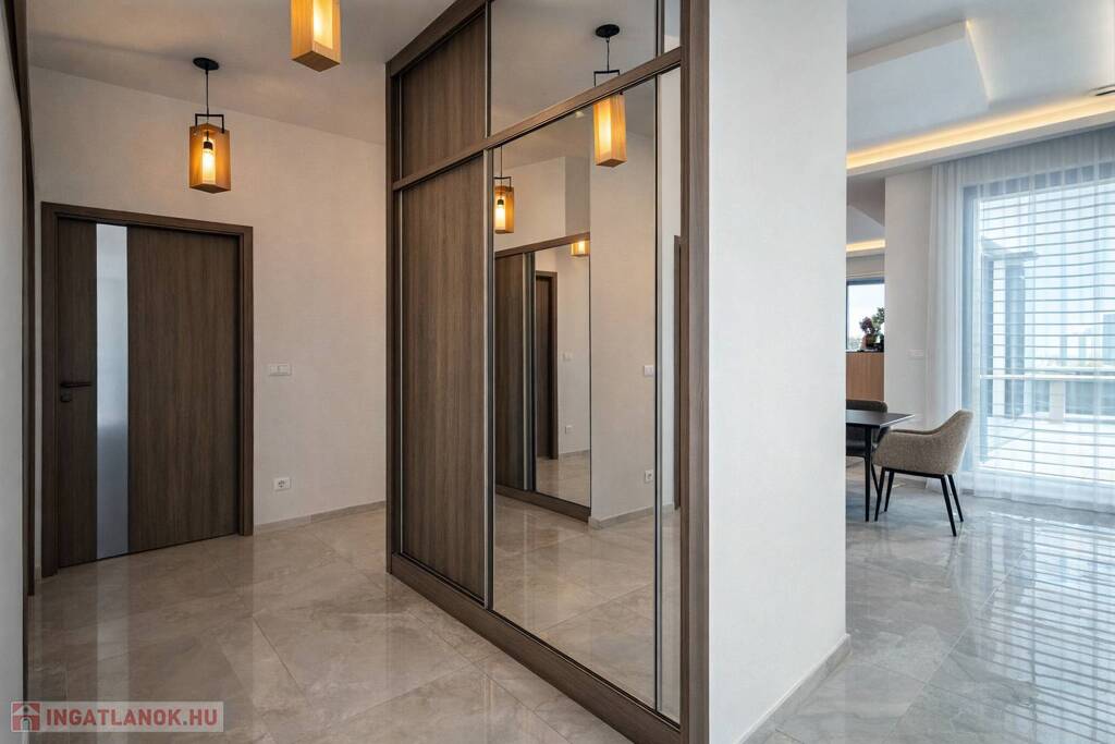 3 hálószoba (ebből egy gardróbos, egy panorámás erkéllyel), fürdőszoba káddal és zuhanyzóval, közlekedő beépített szekrényekkel