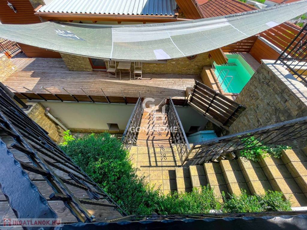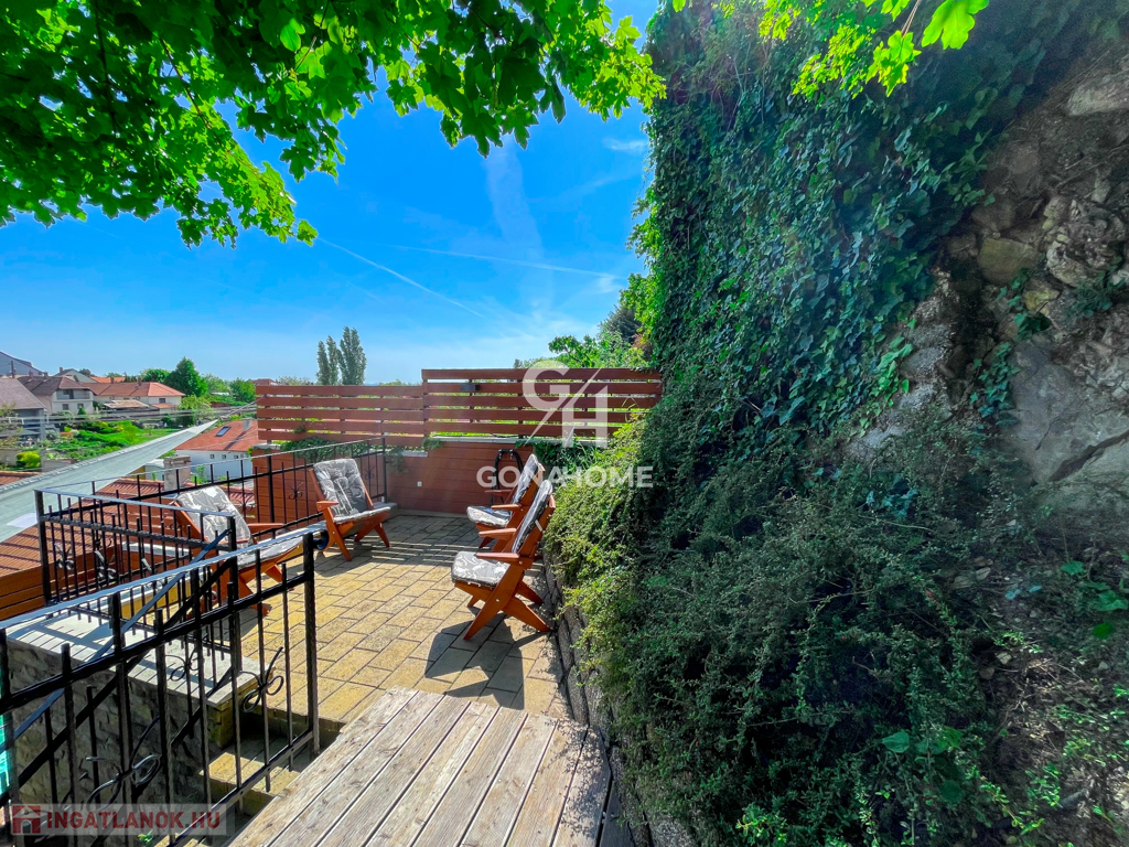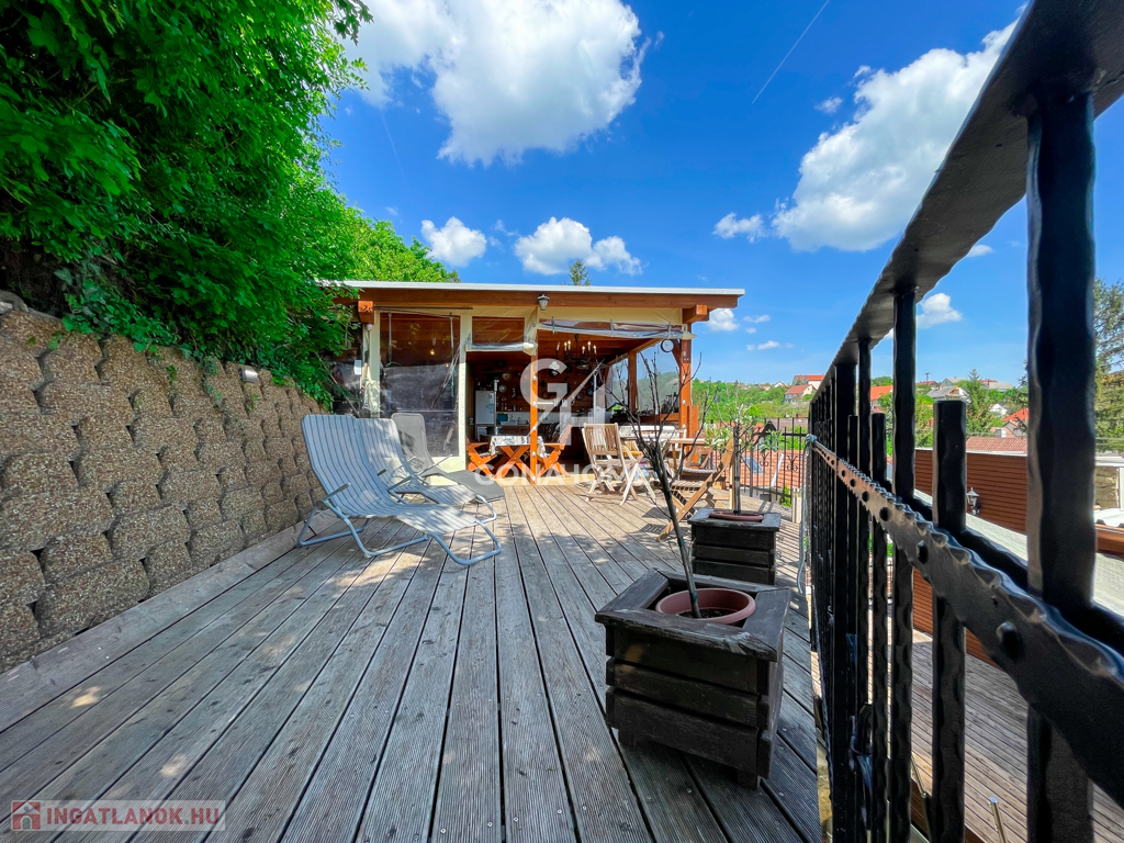 A telek felső szintjén kialakításra került egy térkövezett napozó terasz, egy kb. 30 m2 vörösfenyő terasszal. Itt helyezkedik el a fedett grillterasz, ami kb.50 m2 és külön WC-vel, mosogatóval, konyhapulttal és kemencével rendelkezik.